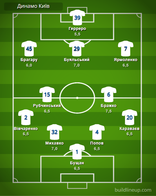 «Динамо» Киев (замены): Кабаев – 6,0, Волошин – 6,0, Биловар – 6,0, Михайленко – 6,0, Дячук – б/о.