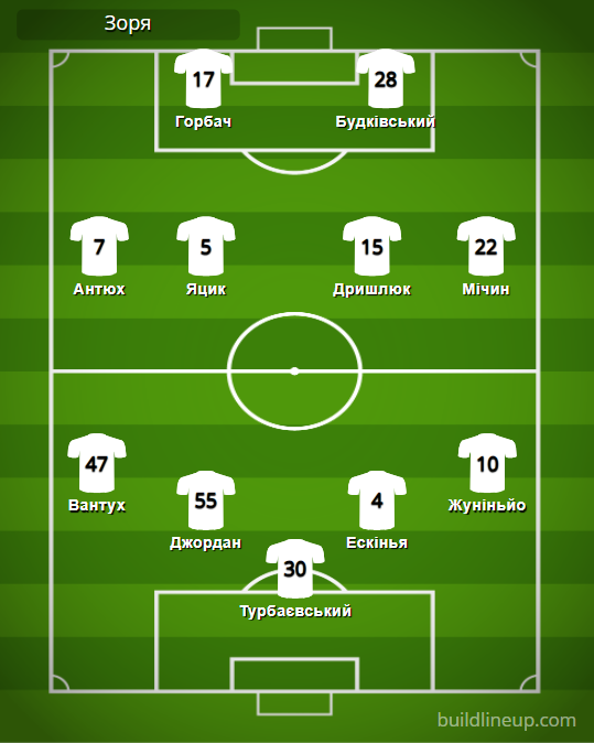 «Заря»: Турбаевский – Вантух (Тронтель, 89), Джордан, Эскинья, Жуниньо (Кирюханцев, 72) – Антюх, Яцик, Дрышлюк (Хахлев, 89), Мичин – Горбач (Вакула, 88), Будковский (Супряга, 90+2).