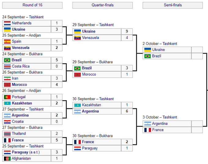 2 октября в полуфинале сойдутся Украина и Бразилия, а 3 числа того же месяца – Аргентина и Франция. Обе встречи начнутся в 18:00 по Киеву и пройдут в Ташкенте.