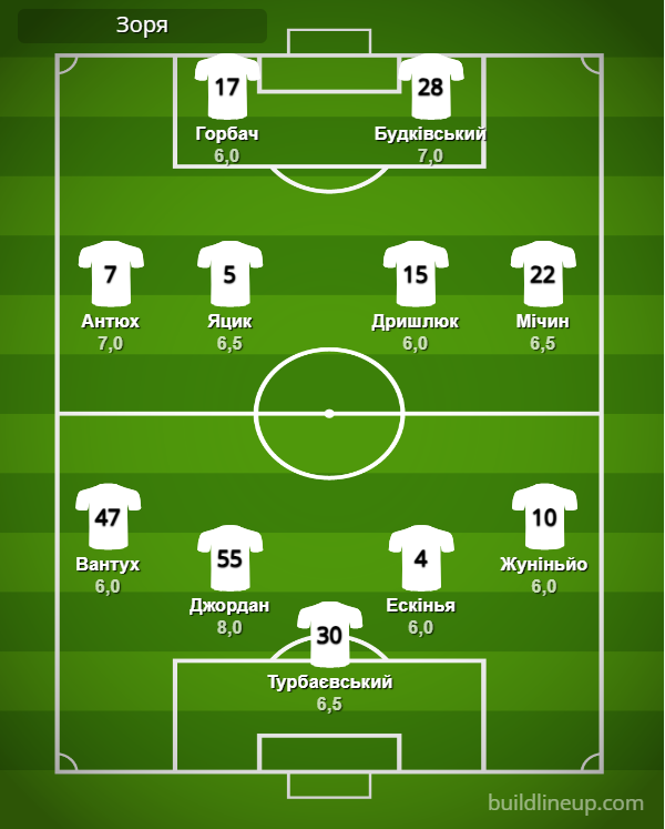 «Заря»: Турбаевский – Вантух (Тронтель, 89), Джордан, Эскинья, Жуниньо (Кирюханцев, 72) – Антюх, Яцик, Дрышлюк (Хахлев, 89), Мичин – Горбач (Вакула, 88), Будковский (Супряга, 90+2).