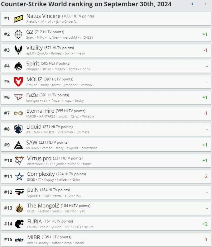 Топ-15 рейтинга замыкают бразильские команды FURIA и MIBR, которые заняли 14-е и 15-е места соответственно. FURIA поднялись на две позиции благодаря недавним успешным выступлениям на турнирах.