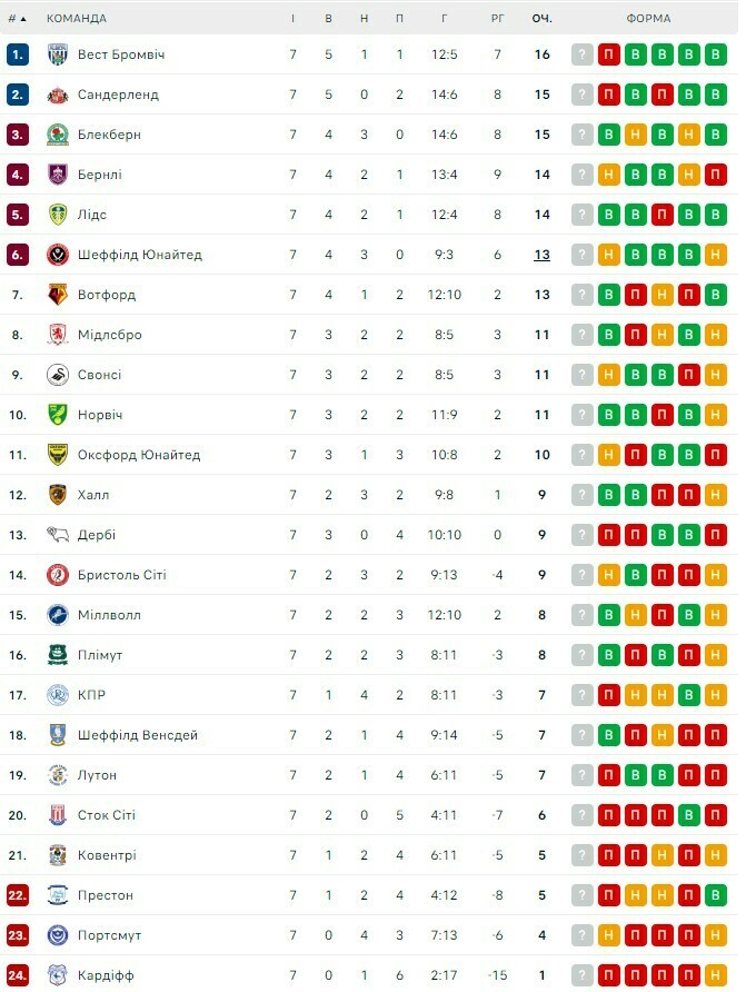 Сандерленд делит 2-е место с Блэкберном (по 15 очков), а лидирует Вест Бромвич (16).
