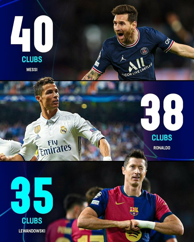 Большему количеству команд в Лиге чемпионов забили только Криштиану Роналду (38) и Лионель Месси (40).