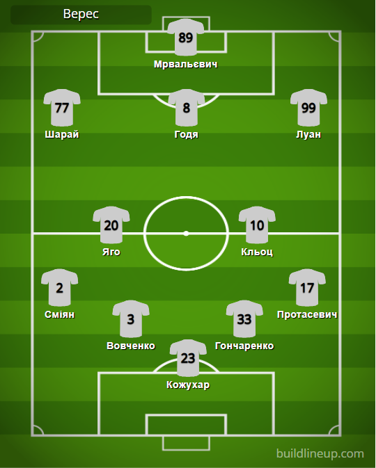 «Верес»: Кожухарь (Когут, 46) – Смиян, Вовченко, Гончаренко, Протасевич (Гакман, 46, Чечер, 75) – Яго, Клец – Шарай, Годя (Кучеров, 65), Луан – Мрвалевич (Гайдучик, 61).
