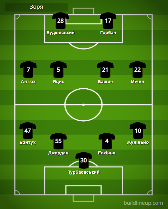 «Заря»: Турбаевский – Вантух, Джордан, Эскинья, Жуниньо (Бенито, 69) – Антюх, Яцык (Тронтель, 69), Башич (Супряга, 58), Мичин – Будковский, Горбач (Хахлев, 58).