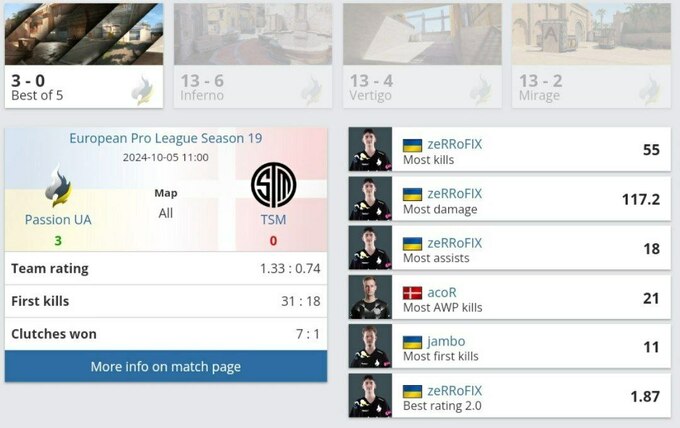 Невероятный игрок команды, Эдуард «zeRRRoFIX» Петровский, показал доминирующую игру, совершив больше всех убийств (55), нанеся наибольший урон (117.2) и сделав больше всего ассистов (18) в матче. Также стоит отметить его высший рейтинг 2.0 — 1.87. Но настоящей кульминацией стал невероятный клатч 1v5 от игрока jackasmo, который решил исход одной из ключевых карт. Его спокойствие и тактическая игра обеспечили команде критически важный раунд и приблизили Passion UA к победе.