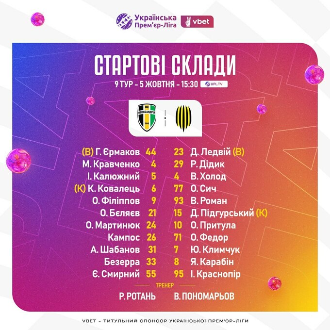 Стали известны стартовые составы на матч между Александрией и Рухом