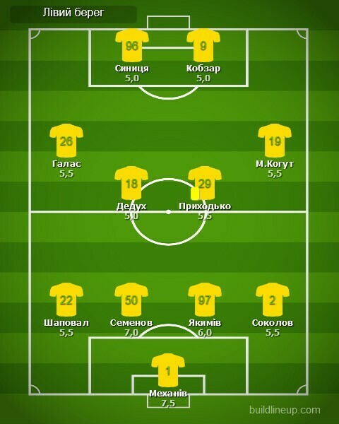 «Левый берег»: Механив, Шаповал, Семенов, Акимов, Соколов, Дедух, Приходько (Банада, 85), М.Когут (Войцеховский, 75), Синица (Спиваков, 75), Галас (И.Когут, 75), Кобзарь (Сухоручко, 46)
