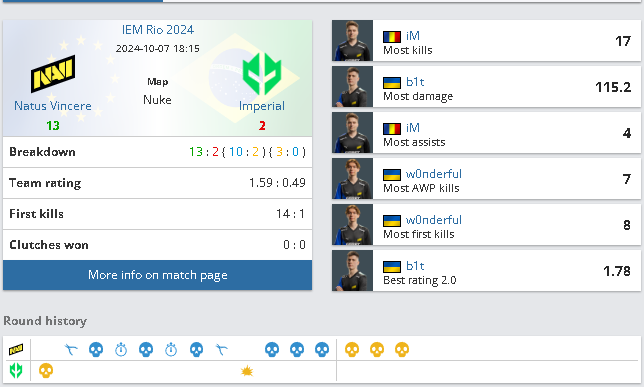 В рамках турнира IEM Rio 2024 команда Natus Vincere одержала уверенную победу над бразильским коллективом Imperial, завершив матч на карте Nuke со счётом 13:2. Игроки NAVI показали доминирующую игру с самого начала, выиграв первую половину со счётом 10:2, а во второй безупречно завершили матч — 3:0.