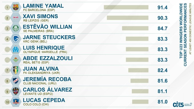 Возглавил рейтинг 17-летний форвард Барселоны Ламин Ямал, в топ-3 также вошли Хави Симонс из РБ Лейпциг и Эстевао Виллиан из Палмейраса.