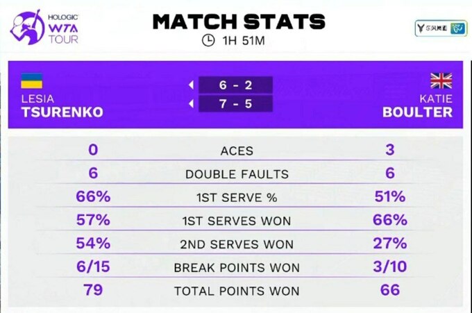 В 1-м раунде основной сетки украинка в двух сетах переиграла 34-ю ракетку мира Кэти Бултер из Великобритании за 1 час и 51 минуту.