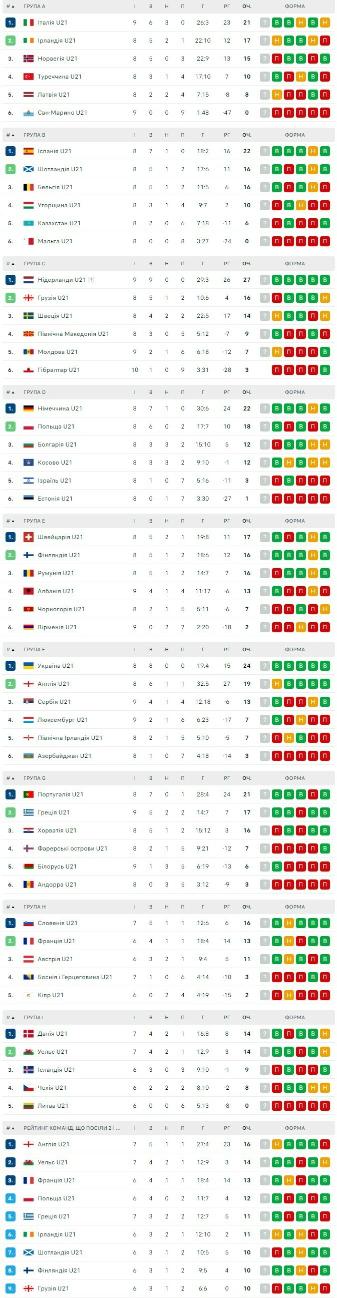 Турнирные таблицы квалификации Евро-2025 U-21