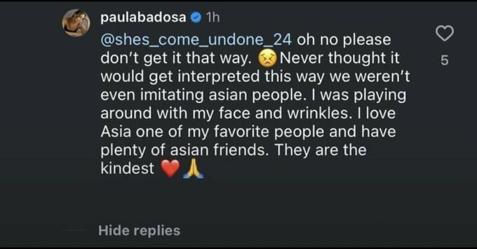 «Всем привет! Мне очень жаль, я не знала, что это может быть воспринято, как расистское оскорбление. Это моя ошибка. Я беру на себя всю ответственность. Эти ошибки меня научат. Надеюсь, вы меня поймете... Люблю всех вас», – извинилась Паула в своем Instagram.