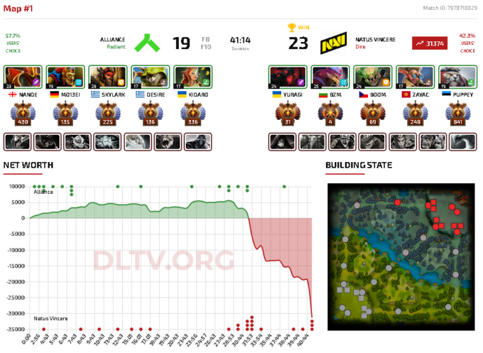 Первая карта: Alliance начали уверенно, контролируя темп игры до середины матча. Однако NAVI сумели переломить ход событий ближе к концу, отстояв ключевые моменты и одержали победу со счётом 23:19. График прироста золота ярко демонстрирует, как после 30-й минуты NAVI смогли доминировать, несмотря на преимущество Alliance в первые полчаса игры.
