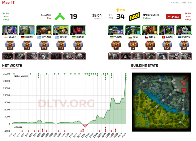 Третья карта: Решительная игра от NAVI. Команда контролировала весь процесс с самого начала, уверенно увеличивая своё преимущество на всех фронтах. График прироста золота показывает, как NAVI наращивали преимущество, выиграв матч со счётом 34:19 и обеспечив себе место в плей-офф.