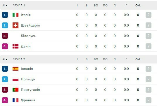 Группа A: Италия, Швейцария, беларусь, Дания. Группа B: Испания, Польша, Португалия, Франция.