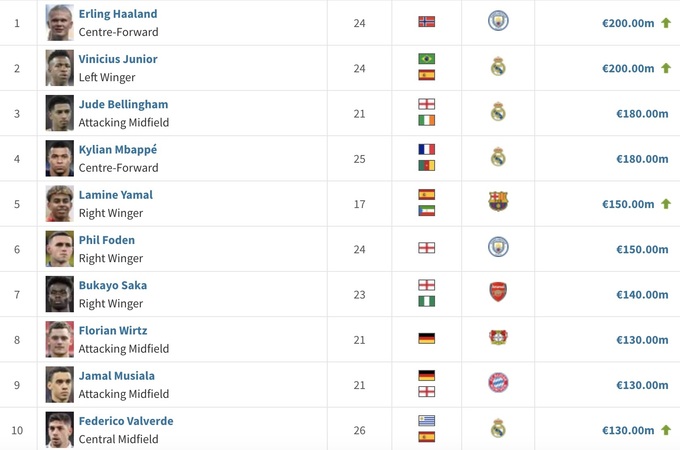 Поднялись в цене главный претендент на Золотой мяч 2024 Винисиус Жуниор из «Реала» и лидер «Манчестер Сити» Эрлинг Холанд. Теперь двое стоят по 200 миллионов долларов. Они лидеры списка.