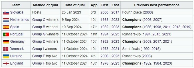 - Словакия (хозяин), Нидерланды, Испания, Португалия, Германия, Дания, Украина, Англия.