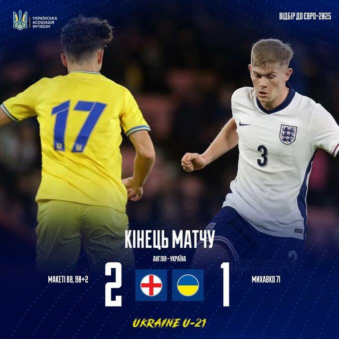 Тарас Михавко открыл счет, но дубль Джеймса Макати в конце игры принес Англии U-21 победу над Украиной U-21 (2:1).