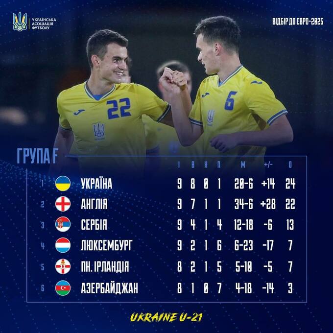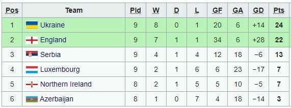 Турнирное положение в группе: Украина (24 очка), Англия (22), Сербия (13), Люксембург, Северная Ирландия (по 7), Азербайджан (3).