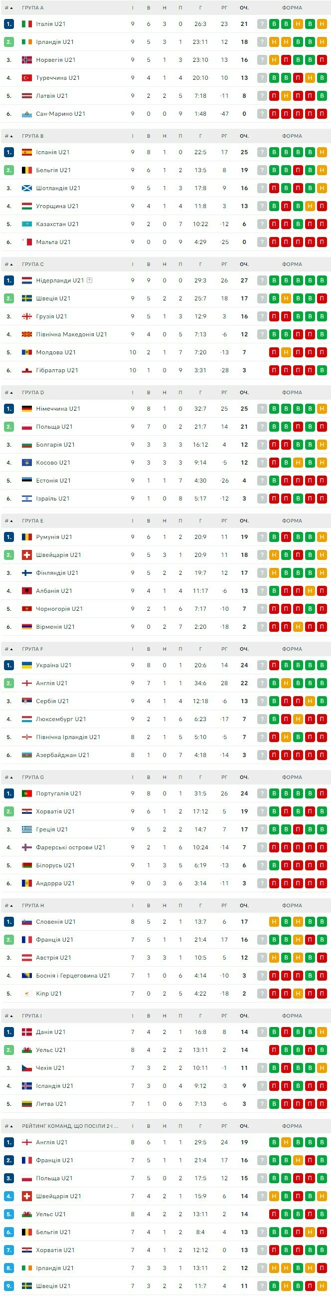 Таблицы Евро-2025 U-21. Кто вместе с Украиной вышел в финальный раунд?