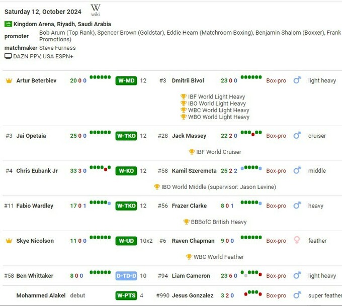Вечером 12 октября в Эр-Рияде (Саудовская Аравия) состоялось шоу бокса с поединком за титул абсолютного чемпиона мира в полутяжелого весе (до 79,4 кг).