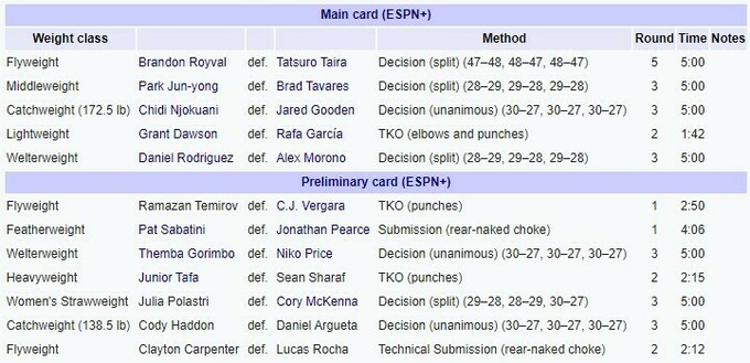 Брэндон Ройвал по очкам победил Тацуро Таиру в главном бою UFC