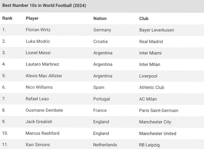 В топ-11 рейтинга также попали Нико Уильямс, Рафаэл Леау, Усман Дембеле, Джек Грилиш, Маркус Рэшфорд и Хави Симонс.