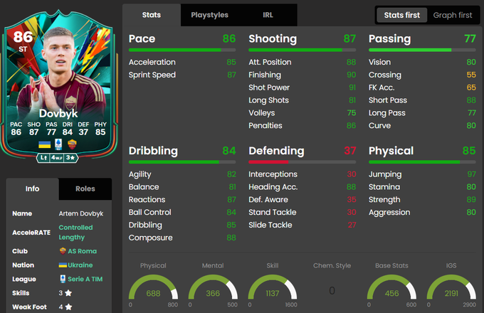 27-летний украинский форвард Артем Довбик получил новую карточку в игре EA Sports FC 25.