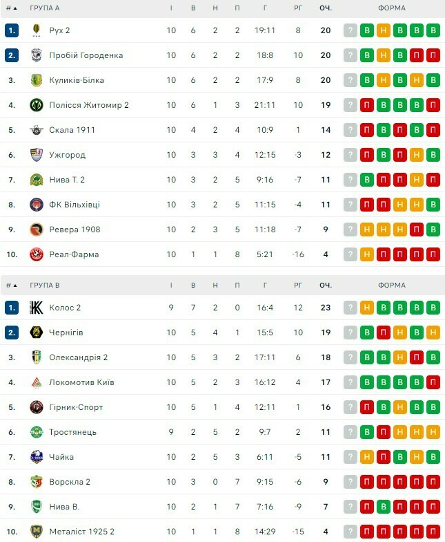 На вершине первой группы Второй лиги установилось троевластие: Рух-2, Пробой и Куликов-Белка набрали по 20 очков после 10 матчей.