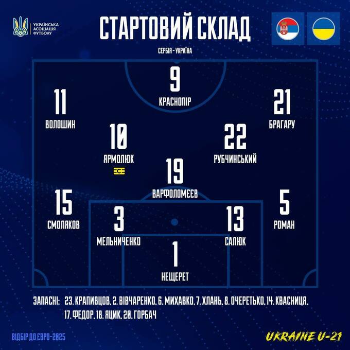 15 октября в 21:30 сборная Украины U-21 сыграет заключительный матч квалификации Евро-2025 U-21 против команды Сербии U-21.