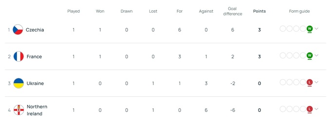 Добившись крупной победы, чешская сборная занимает 1-е место в турнирной таблице группы, за ней идет сборная Франция. Украина на 3-м месте, сборная Северной Ирландии – 4-я.