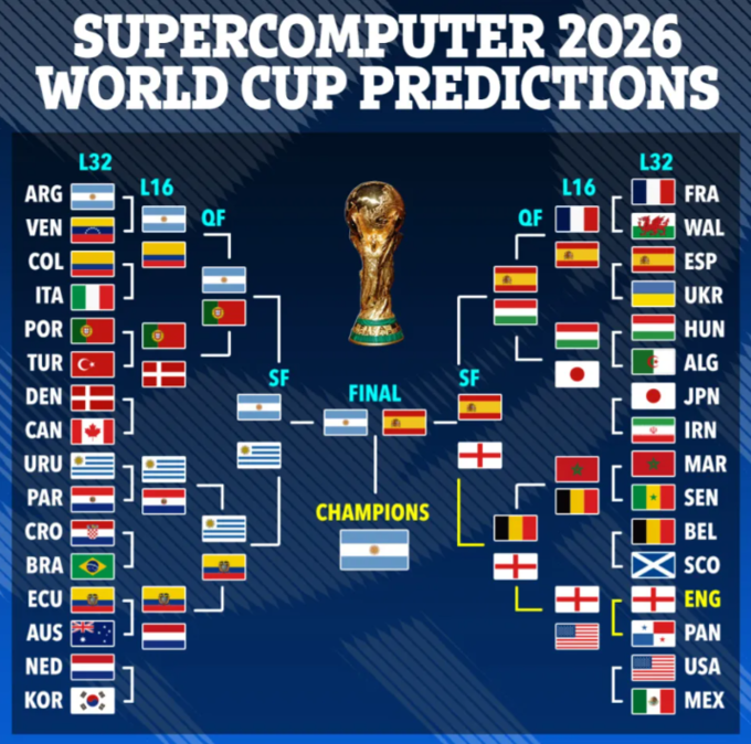Британцев, в первую очередь, интересовали шансы их национальной команды, которую, как известно, с 1 января 2025 года возглавит немец Томас Тухель. Так вот – англичане должны дойти до полуфинала, где проиграют Испании. Та, в свою очередь, в финале потерпит поражение от сборной Аргентины, которая, как получается, должна выиграть второй мундиаль подряд.