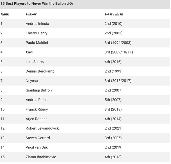 Авторитетный британский портал Give Me Sport обнародовал рейтинг лучших футболистов, которые никогда не выигрывали Золотой мяч.