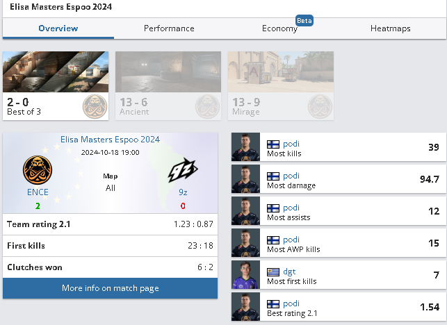 Среди ключевых игроков ENCE особенно выделился финский киберспортсмен Пааво «podi» Хейсканен, который заработал наибольшее количество убийств (39), нанёс больше всего урона (94.7), а также стал лидером по количеству ассистов (12) и снайперских попаданий (5). Командный рейтинг ENCE составил 2.1, что значительно превзошло показатели команды 9z.