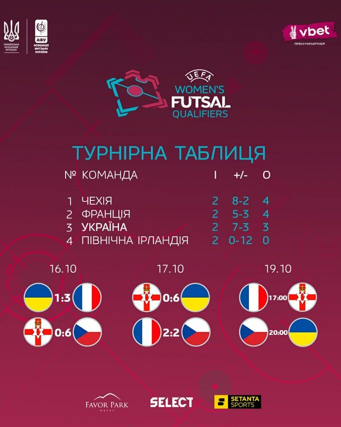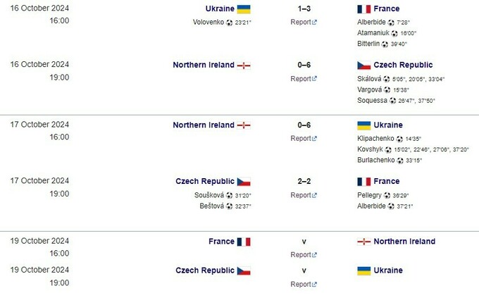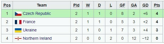 - Турнирное положение: Франция (4), Чехия (4), Украина (3), Северная Ирландия (0).