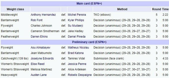 В главном бою встретились: Энтони Эрнандес (США, 12–2) – Мишел Перейра (Бразилия, 31–11)