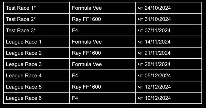 Турнир будет состоять из шести этапов, где участники сразятся за титул чемпиона. Трассы будут объявлены до 8 ноября 2024 года, а первые официальные заезды начнутся после этого. Однако уже сейчас вы можете насладиться тестовыми гонками, которые состоятся 24 октября, 31 октября и 7 ноября. Эти этапы станут отличной возможностью для зрителей увидеть подготовительные заезды и оценить формат соревнований.