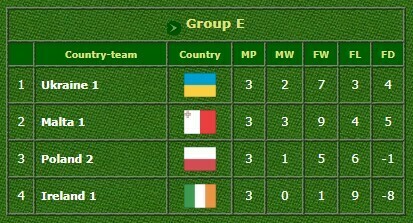 Итоговое положение в группе: 1. Мальта-1 (3 победы), 2. Украина-1 (2 победы), 3. Польша-2 (1 победа), 4. Ирландия-1 (0 побед).