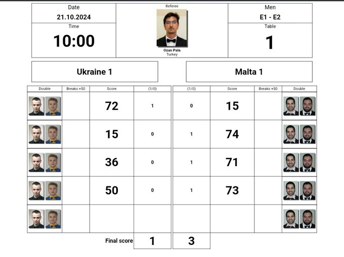 21 октября в 3-м туре Украина-1 проиграла Мальте-1 в матче за первое место (1:3).