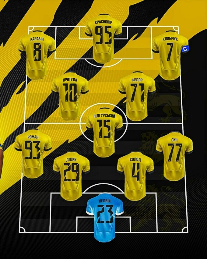 Стартовый состав ФК «Рух»: Ледвий, Холод, Дидык, Сыч, Роман, Пидгурский, Притула, Федор, Карабин, Климчук, Краснопир.