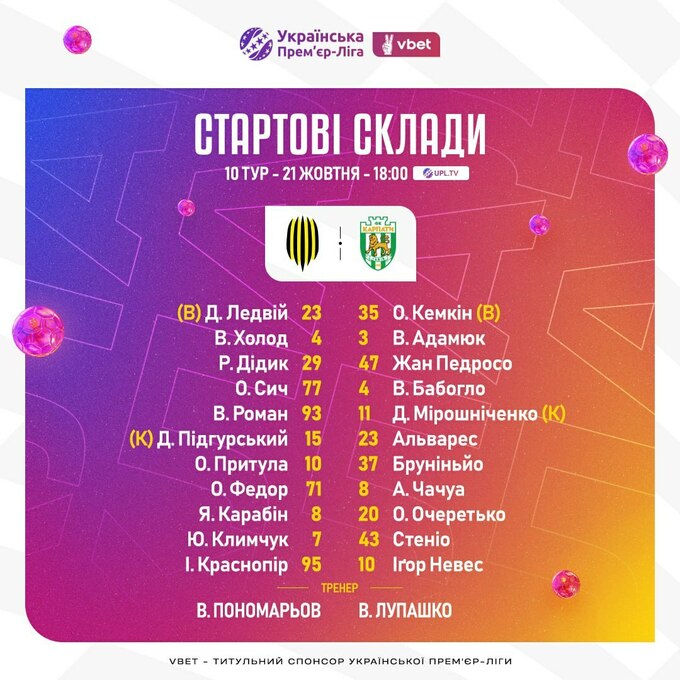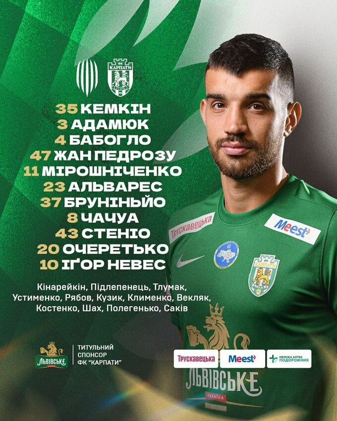 Стартовый состав ФК «Карпаты»: Кемкин, Адамюк, Жан Педроссо, Бабогло, Мирошниченко, Альварес, Бруниньо, Чачуа, Очеретько, Стенио, Игор Невес.