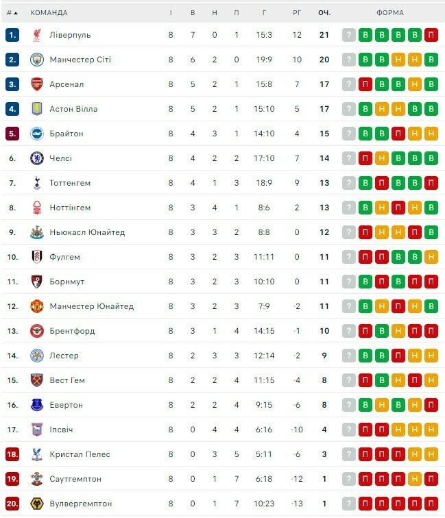 Лидеры АПЛ: Ливерпуль (21), Манчестер Сити (20), Арсенал (17), Астон Вилла (17), Брайтон (15), Челси (14).