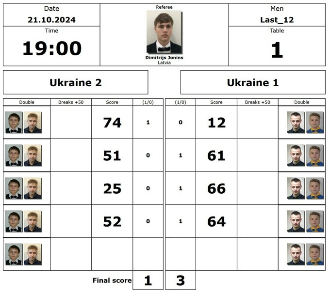 В матче 1/8 финала Украина-1 обыграла Украину-2 со счетом 3:1. Поединки в формате микст проходят до 3 побед во фреймах.