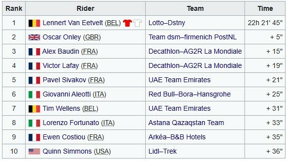 В генеральной классификации первое место занял велогонщик команды Lotto–Dstny Леннарт Ван Этвелт из Бельгии.
