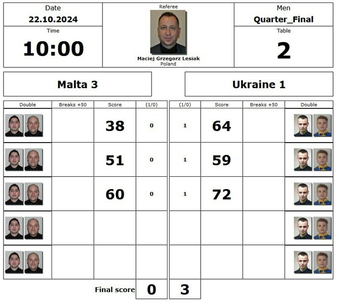 22 октября в 12:00 в 1/4 финала Украина-1 всухую разгромила команду Мальты-3 (3:0) и вышла в полуфинал, где в 18:00 сыграют с командой Польша-4.
