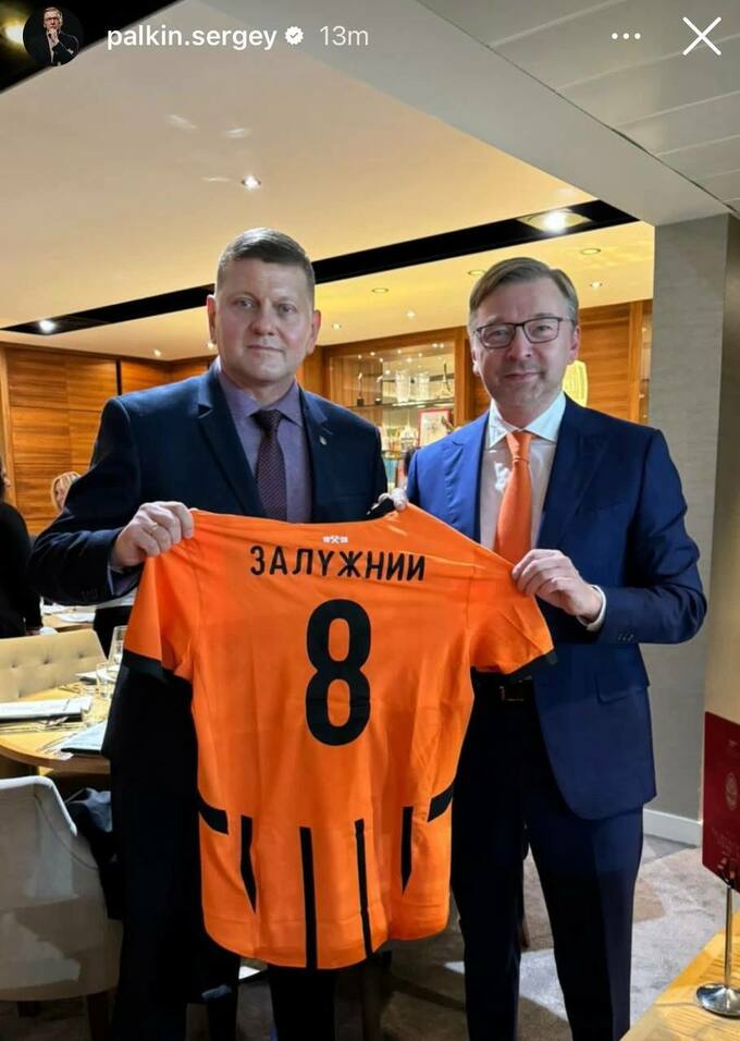 Залужный, который считается фанатом киевского Динамо на внутренней арене Украины, получил именную футболку от генерального директора донецкого клуба Сергея Палкина. Соответствующее фото появилось в Instagram Палкина.