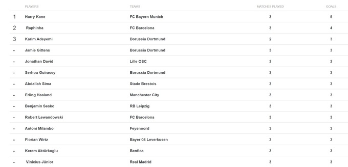 Среди бомбардиров Лиги чемпионов произошли небольшие изменения. В единоличные лидеры вышел Гарри Кейн из «Баварии». В 3-м туре он отметился одним голом в поединке против «Барселоны» (1:4). Теперь на счету англичанина 5 голов.