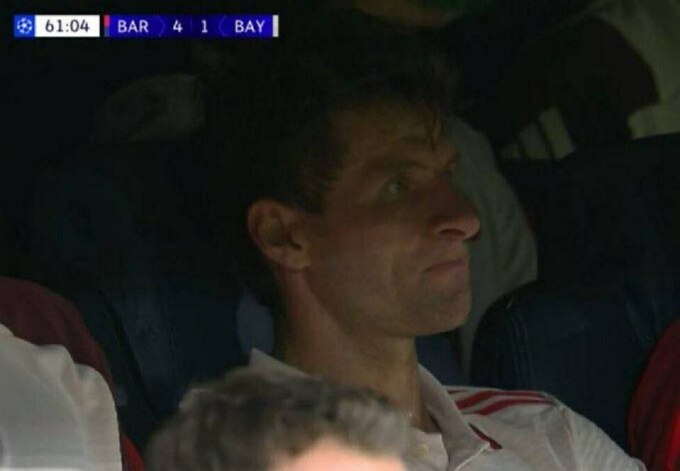 Мюллер отыграл против каталонцев 60 минут, результативными действиями не отличился и был заменен на Джамала Мусиалу уже при счете 1:4. Лицо Томаса после замены говорит само за себя...