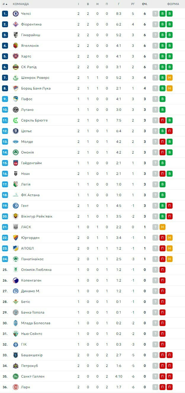 По 6 очков набрали: Челси, Фиорентина, Витория Гимараеш, Ягеллония, Хартс, Рапид.